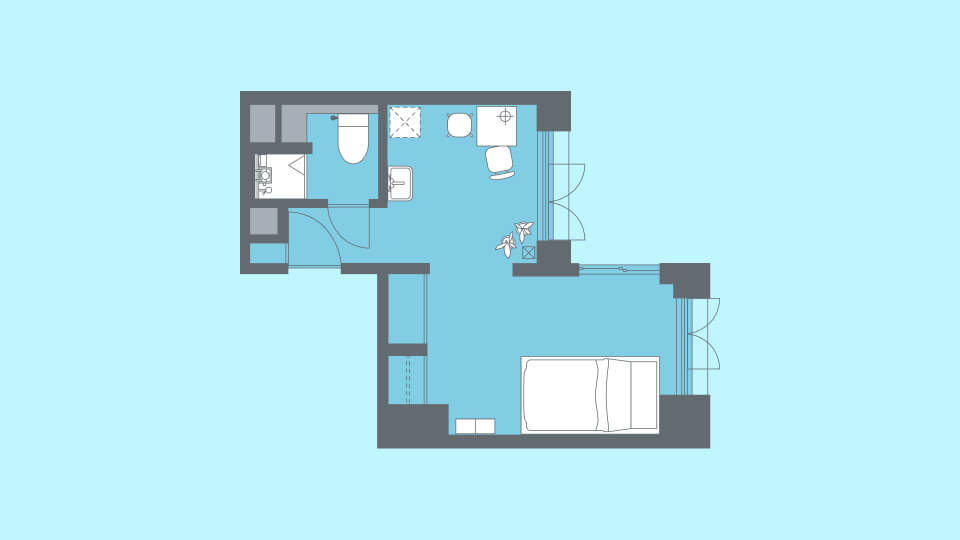 シャワー‧トイレ完備。寝室と執務室が分けられるプラン